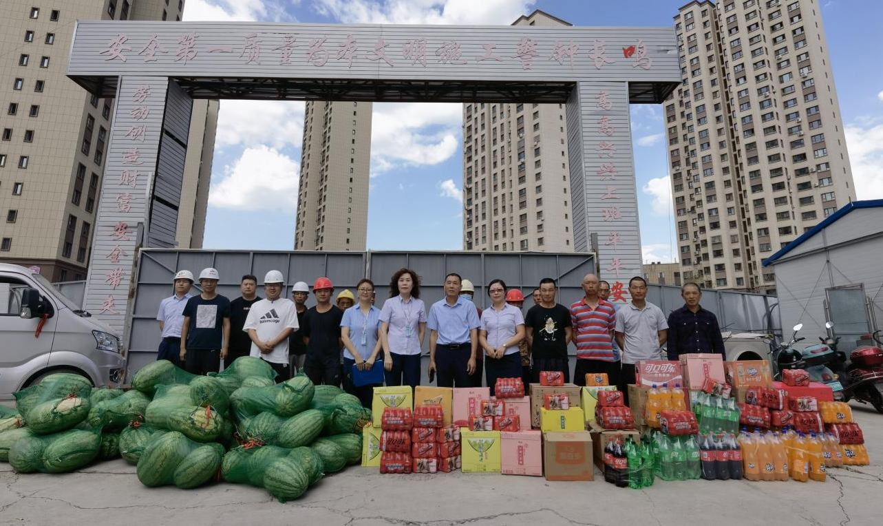 為提高公司一線員工的安全勞動意識,切實維護員工的身心健康,集團公司工會合理統籌計劃,統一購買西瓜、綠豆、飲料、冰糖、菊花茶葉等防暑降溫慰問品。2023年7月24日,由集團黨支部書記盧海軍、工會主席索春梅及工會委員開展“情系一線員工,高溫酷暑送清涼“慰問活動。將防暑慰問品及時送到最需要的員工手中,以實際行動把公司的關愛與溫暖送到員工心坎上。為高溫下仍然奮戰在工作一線的現場施工人員及物業員工帶去公司的關愛與問候,感謝他們在烈日下的堅持,并囑咐大家要及時做好防暑解暑工作,特別現場戶外施工人員要合理調配工作時間,注意休息,避開高溫時段,防止中暑事件發生,做好自身的安全健康防護工作。