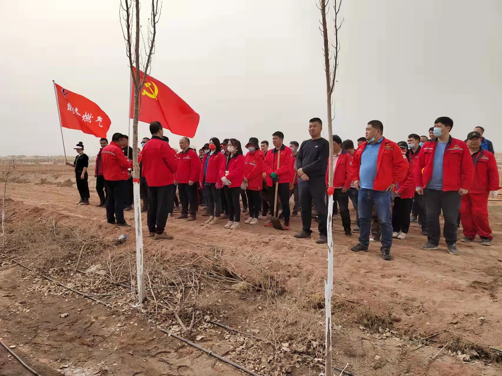 2022年3月18日,由投資公司副總裁楊在新,燃氣公司總經理苗斌及各分管副總帶隊,早晨9:30分整隊出發前往溫宿縣產業園區參加春季植樹。此次植樹活動雖是沙塵天,任務重,但公司全員在各組組長的帶領下,分工明確、合理,秩序井然。大伙干勁十足,植樹熱情高漲,不畏惡劣天氣,最終高質量、高標準的完成了分配植樹區域的植樹任務。并用石灰粉刷白任務區域路邊新老樹木,一次性通過驗收且受到驗收單位的好評。此次活動參與人數達70余人次,累計植樹約1200棵,圓滿完成了此次春季植樹活動。