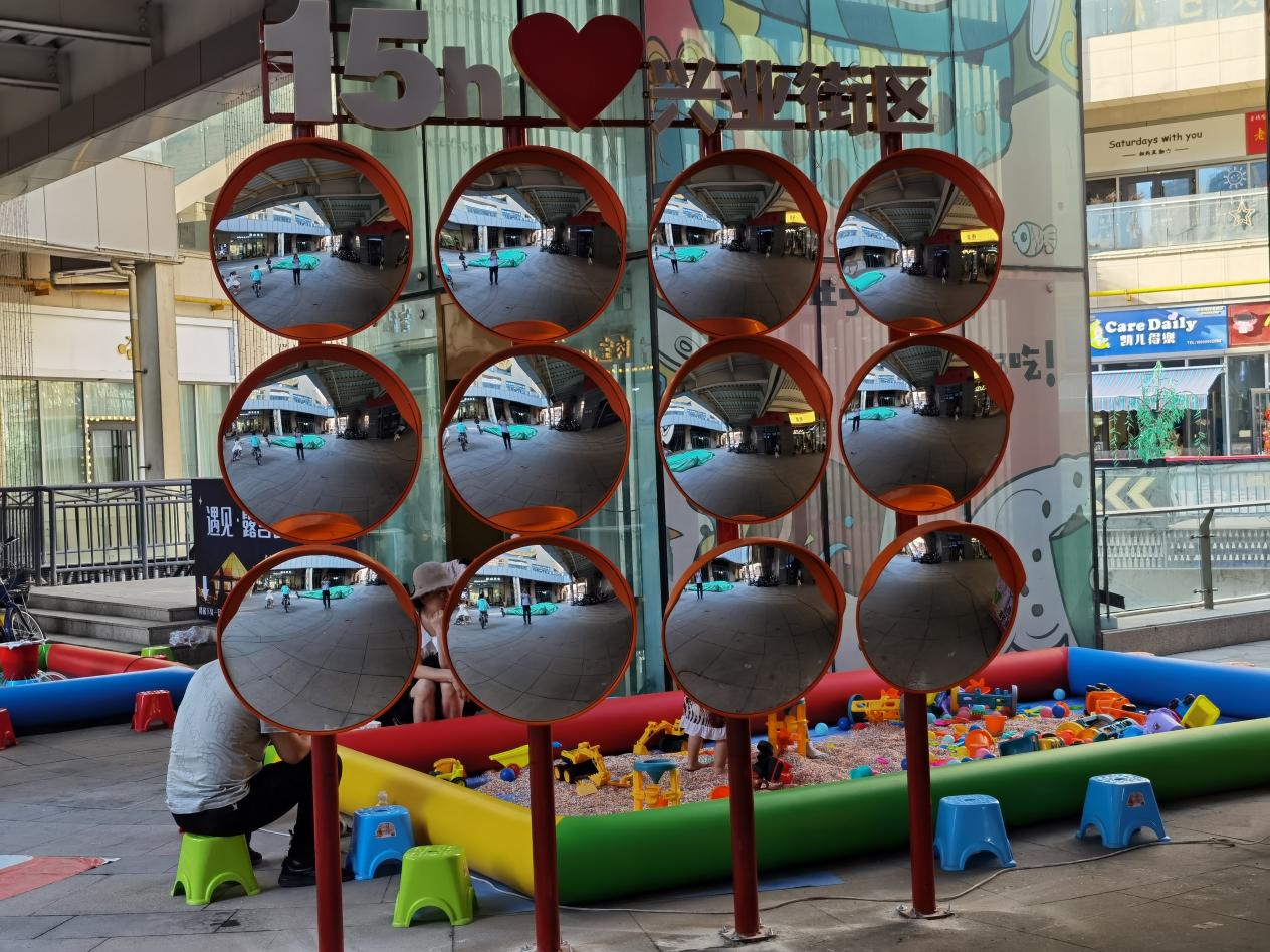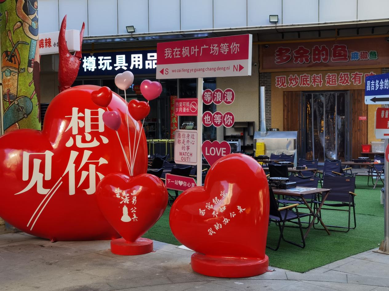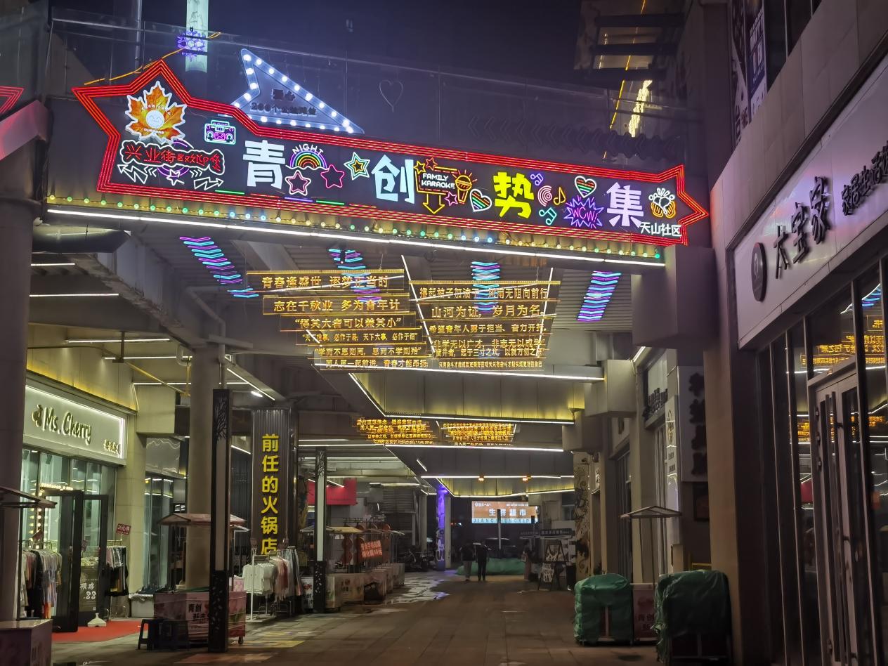 中山興業街全長約1.5公里,轄區業態豐富,涵蓋曦隆·楓葉廣場、匯嘉時代廣場、婚戀廣場等三大中心商業圈,涉及企事業單位13家,每日人流量達10萬以上。社區為規范轄區流動攤販經營、促進商圈經濟發展,有效解決轄區群眾就業問題,建國路街道黨工委、社區黨委、兩新黨支部共同發力,依托中山路商圈資源,建設“活力中山·青創勢集”“生態中山·露營基地”“情暖中山·里約夜市”三個黨建品牌。其中“活力中山·青創勢集”就位于楓葉廣場中山街夜市,由市委宣傳部和社區聯合搭建了“百姓大舞臺”,采取“夜市經濟+百姓舞臺”的方式,每天都有精彩的紅歌合唱、民族團結聯誼舞蹈、惠民政策說唱、詩詞朗誦、現代流行舞蹈等多種豐富多彩的節目,吸引了很多居民到此來觀看,同時也將黨的聲音和關懷傳遞到基層群眾身邊,豐富了群眾文化生活,營造了良好社會文化氛圍,呈現出煙火氣十足的城市夜生活圖景。“活力中山·青創勢集”在搭建中不僅在楓葉廣場內增加了各類網紅打卡點,還安裝了有關于奮斗勵志金句語錄的燈牌,借助現代燈光科技,在夜市上空熠熠閃爍,營造出“青春活力、奮發向上”的氛圍。
