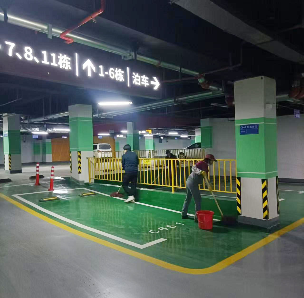 清晨,保潔員們身著統一工作服,帶著清潔工具,精神飽滿地來到地下車庫。他們分工明確,有的負責清掃地面灰塵和垃圾,有的負責擦拭車庫內的設施設備,還有的負責清理排水溝內的雜物。