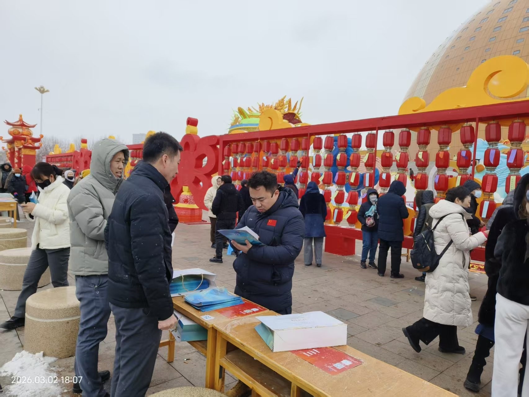 活動現場,熱鬧非凡。新疆大劇院的獨特建筑風格與民俗表演交相輝映,激昂的鼓點中,英歌舞隊率先登場,舞者們身著繡滿絲路紋樣的艷麗服飾,手持雙槌騰挪跳躍,剛勁有力的動作仿佛重現了古絲路商隊的豪邁氣魄,瞬間點燃全場熱情。緊接著,一條金色巨龍在廣場中央盤旋飛舞,舞龍隊員們配合默契,巨龍時而昂首騰飛,時而盤旋游走,精湛技藝贏得陣陣喝彩。另一邊,扭秧歌隊伍踩著歡快節拍而來,大媽們手持彩扇、腰系紅綢,將元宵節的喜慶氛圍推向高潮。